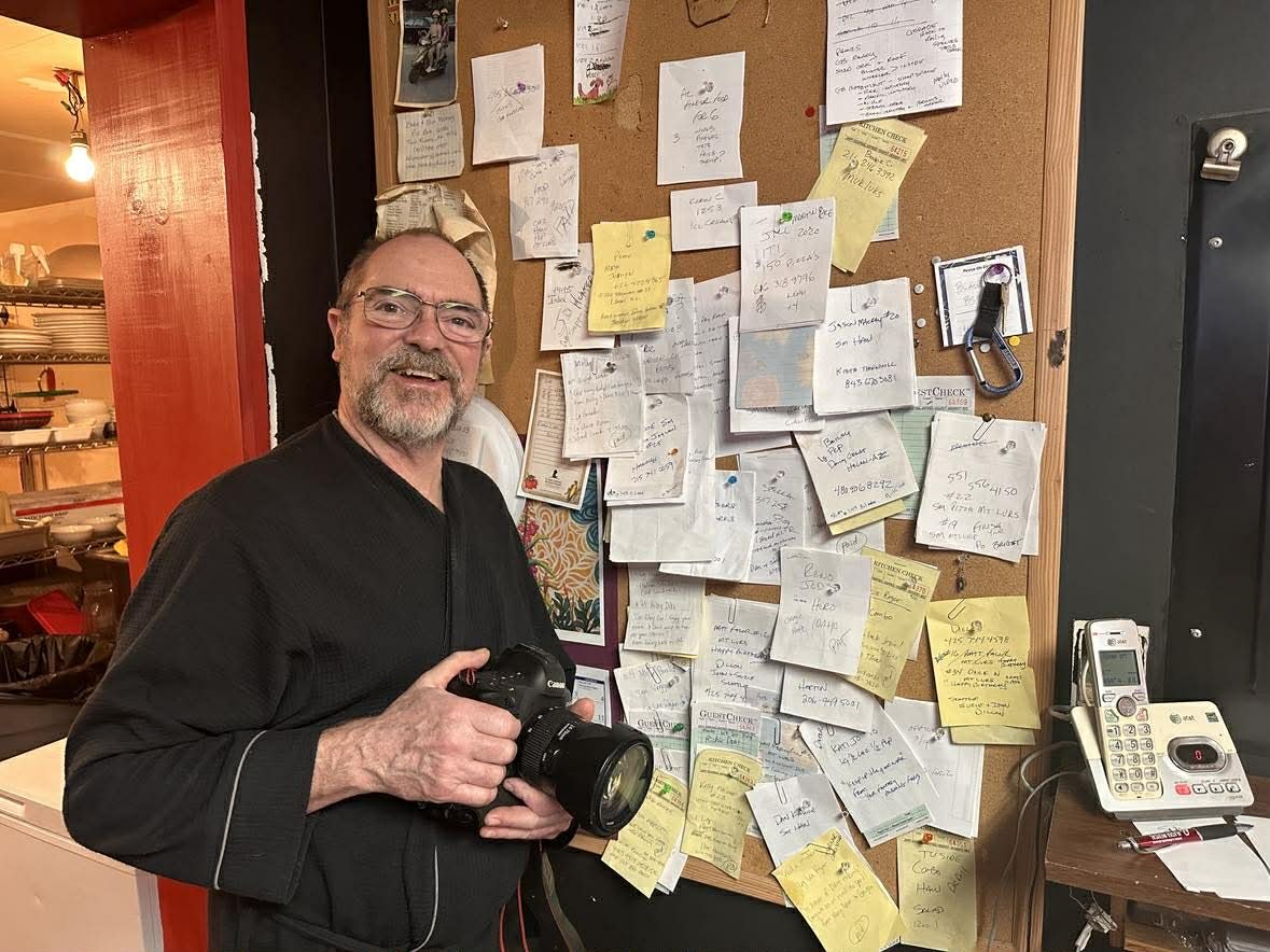 Bret in 2023 with his tracking system for keeping track of orders for mushers and ITI racers. Photo taken by Leah Gruhn.