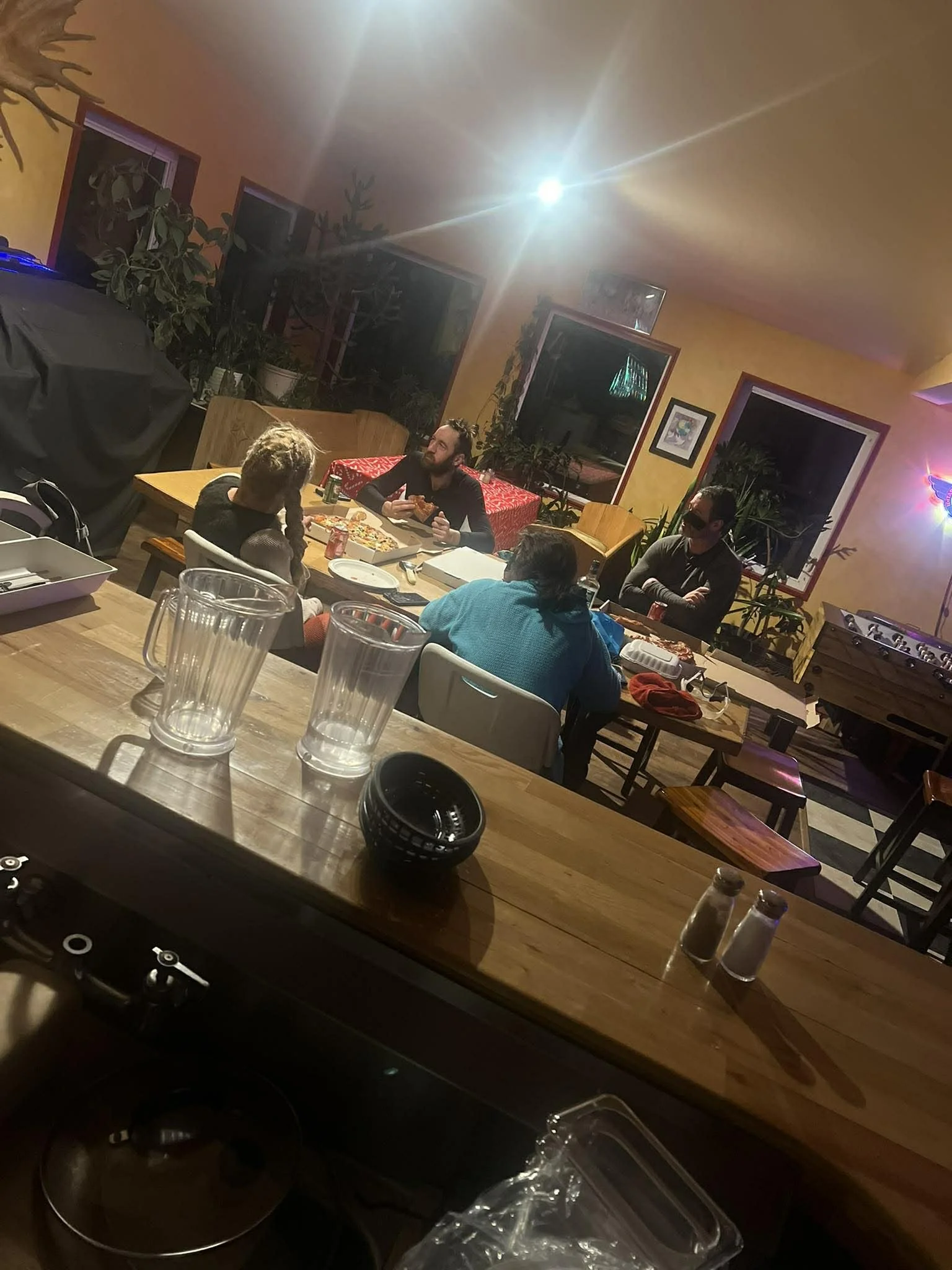 The lead four bikers made a strong overnight push through a cold headwind to arrive in the coastal village of Unakaleet around 3am. They walked up the wooden steps to Peace on Earth Restaurant and were greeted by Bret Hanson and the familiar scent of hot, freshly baked pizza. The Hanson family, Bret and Davida, have been running the popular restaurant since 1996; serving up familiar comforts to travelers of the trail who have been subsisting on freeze dried meals, candy and granola bars for days. It is now tradition for mushers to receive a small stack of pizzas called in by fans from around the country. Alaska Public Media shared this story in 2025 of friends, family and fans making sure mushers knew they were cared for and cheered on. Our intrepid racers also had hot pizza ready and waiting for them.